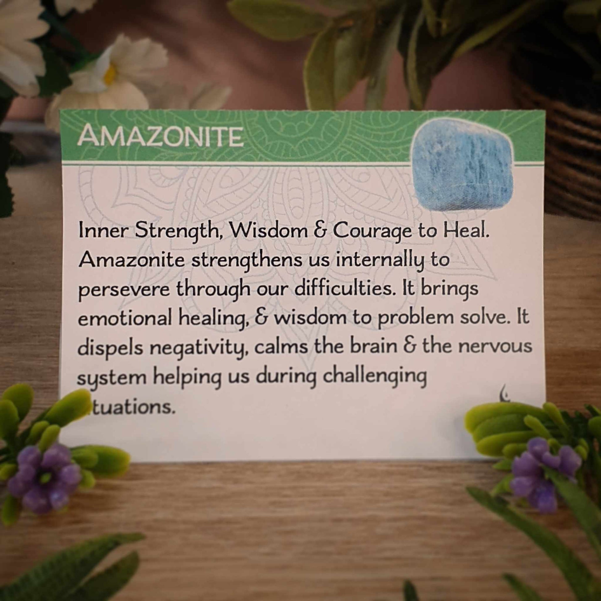 Amazonite gives us the courage to heal. It strengthens us internally to persevere through our difficulties. It brings emotional healing and wisdom to problem solve. Amazonite calms the brain and the nervous system. It dispels negativity and helps us during challenging situations.