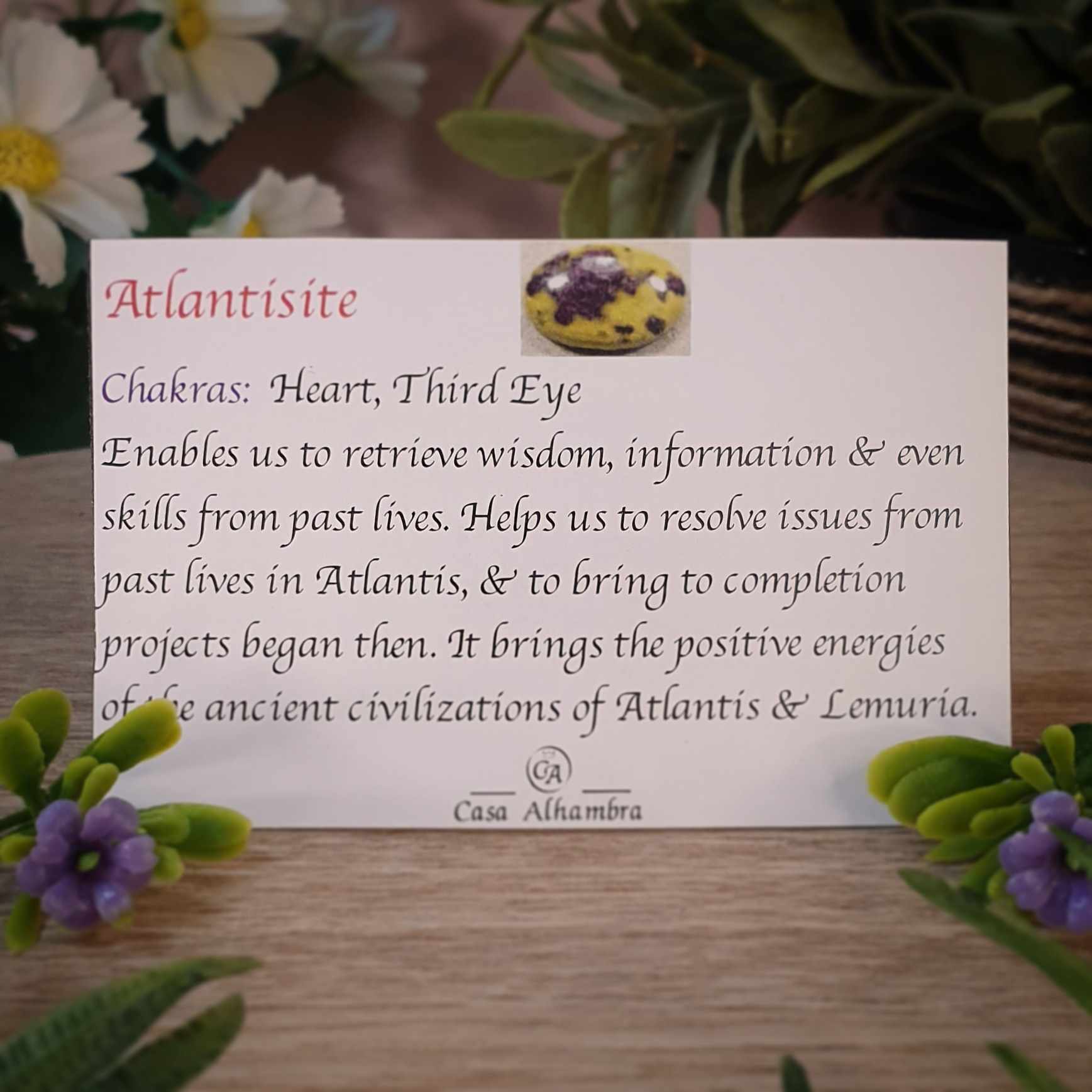 Atlantisite enables us to retrieve wisdom, information and even skills from past lives. Helps us to resolve issues from past lives in Atlantis and to bring to completion projects began then. It brings the positive energies of the ancient civilizations of Atlantis and Lemuria.