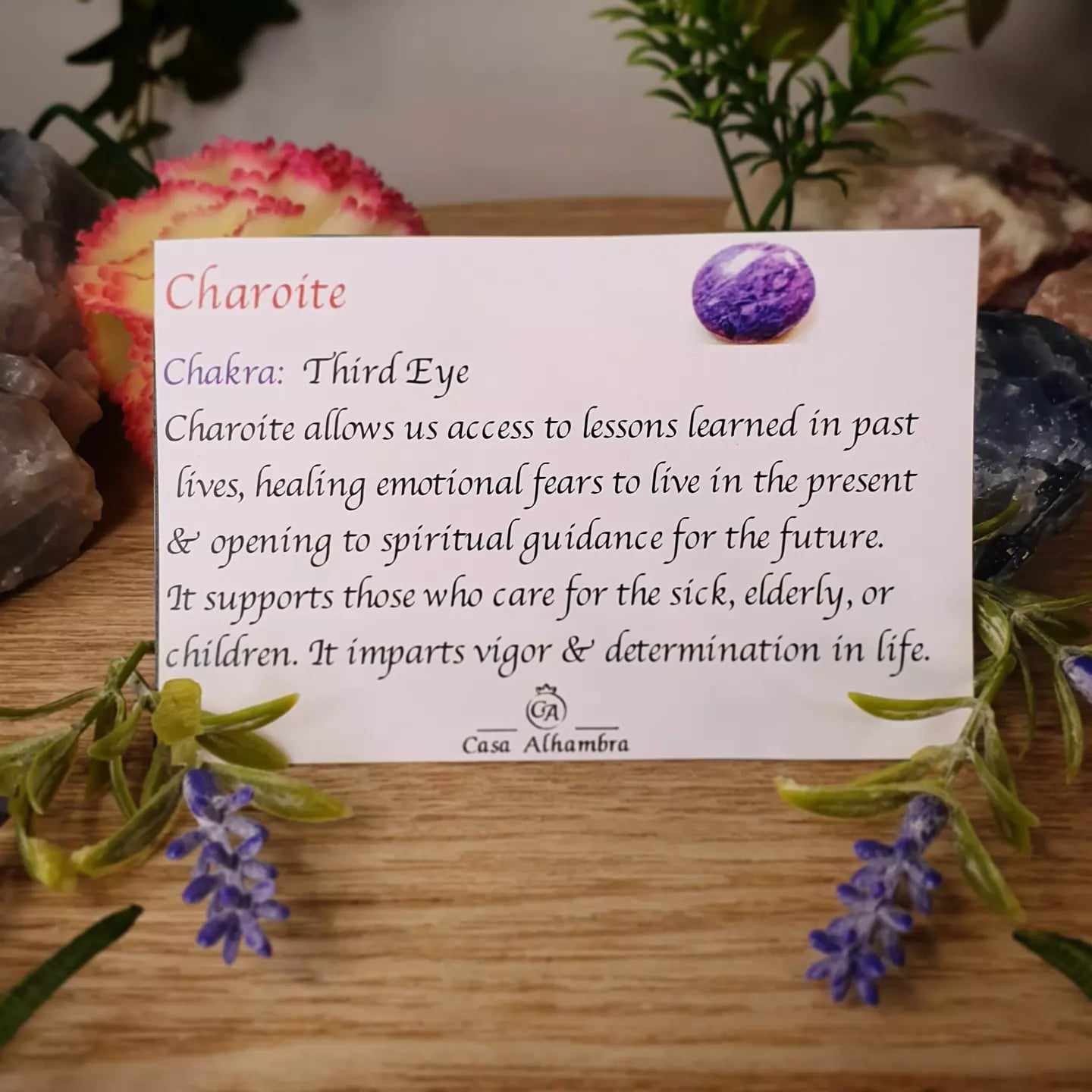 Charoite allows us to access lessons learned in past lives, healing emotional fears to live in the present and opening to spiritual guidance for the future. It supports those who care for the sick, elderly or children. It imparts vigour and determination in life.