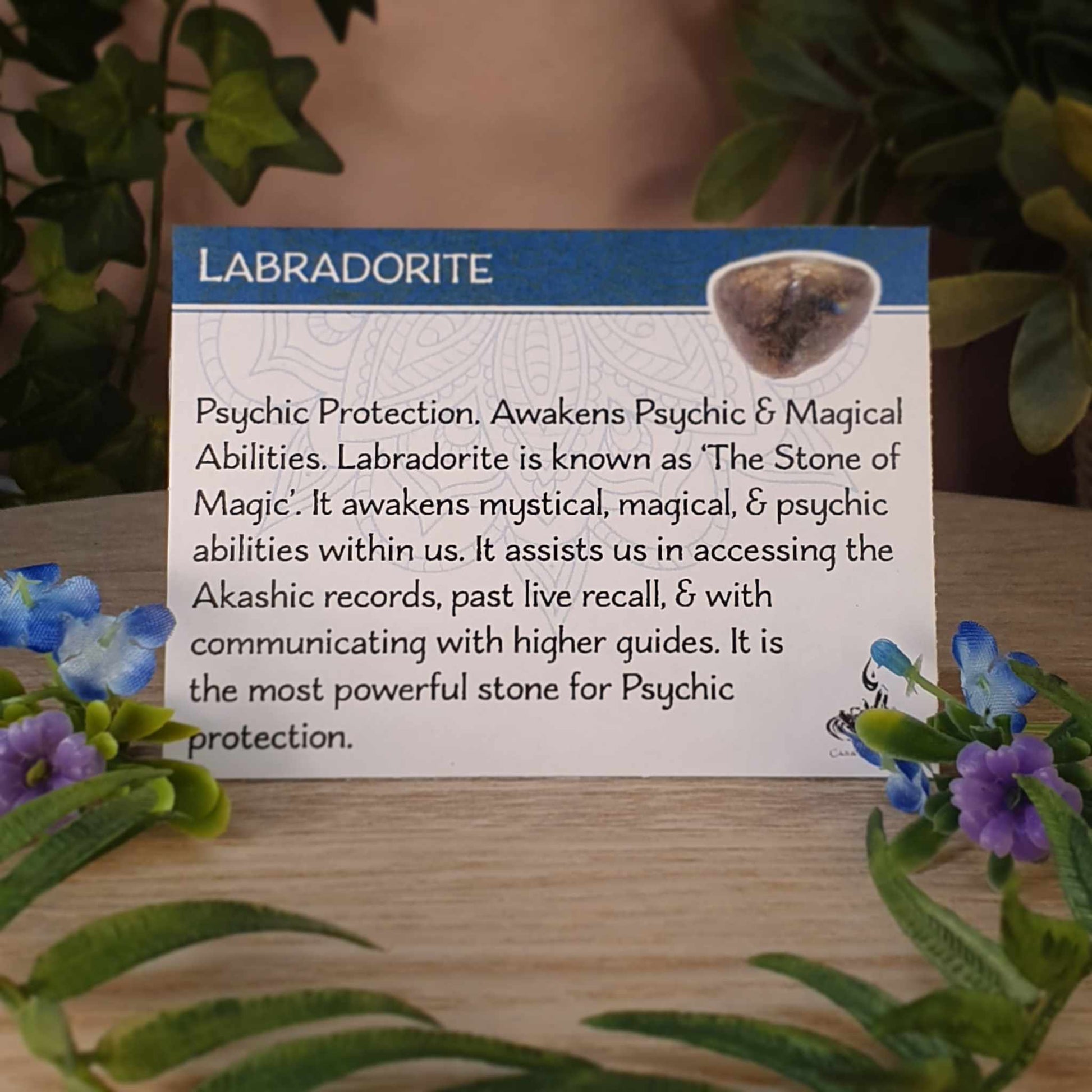 Labradorite is the "Stone of Magic" It awakens mystical and psychic abilities within us. It assists us in accessing the Akashic records, past live recall and also with communication with higher guides. It is the most powerful stone for Psychic protection.