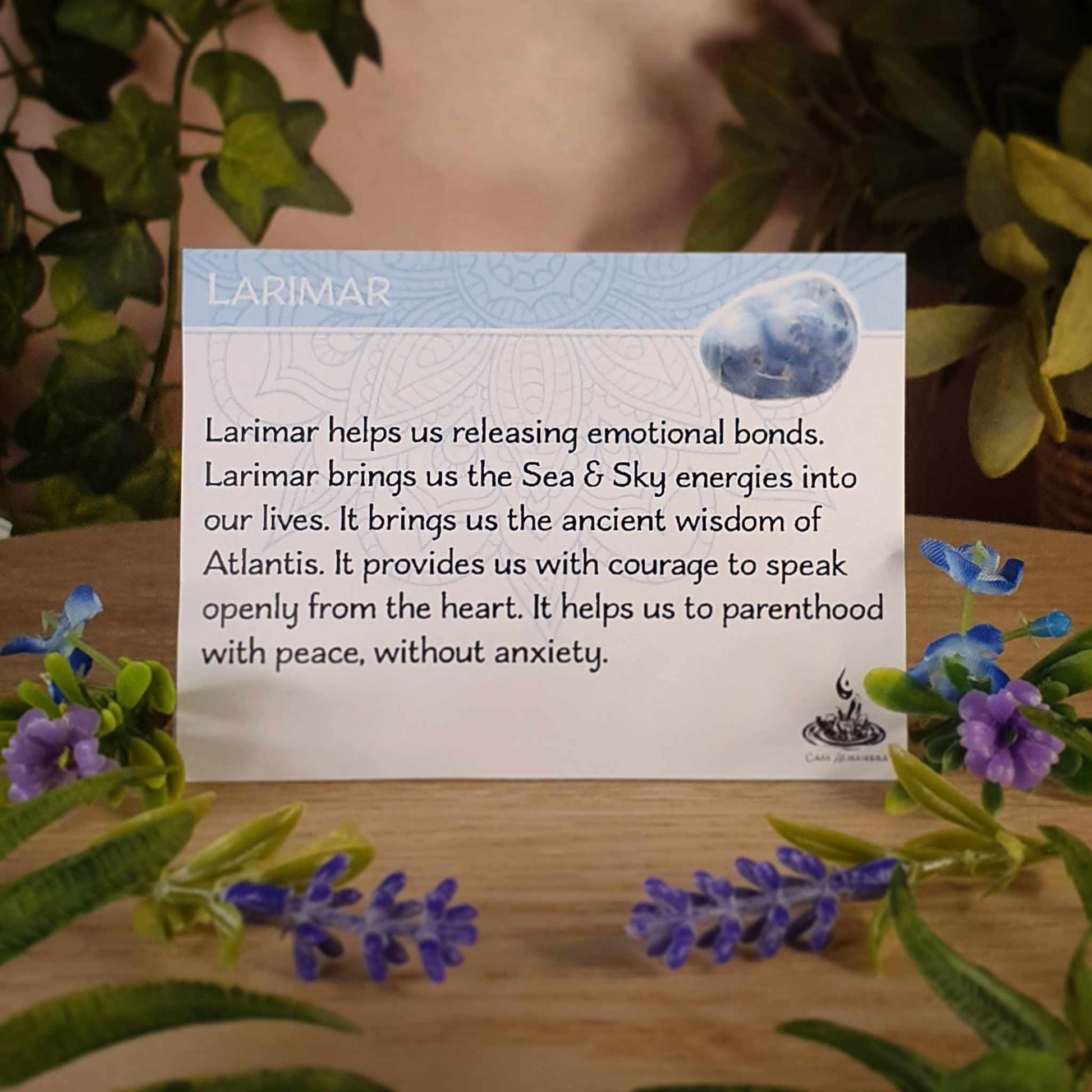 Larimar brings us the energy of the Sea and Sky into our lives. It connects us to the ancient wisdom of Atlantis. Larimar helps us to release emotional bonds and provides us with courage to speak openly from the heart. Larimar also helps us with parenting with peace and without anxiety.