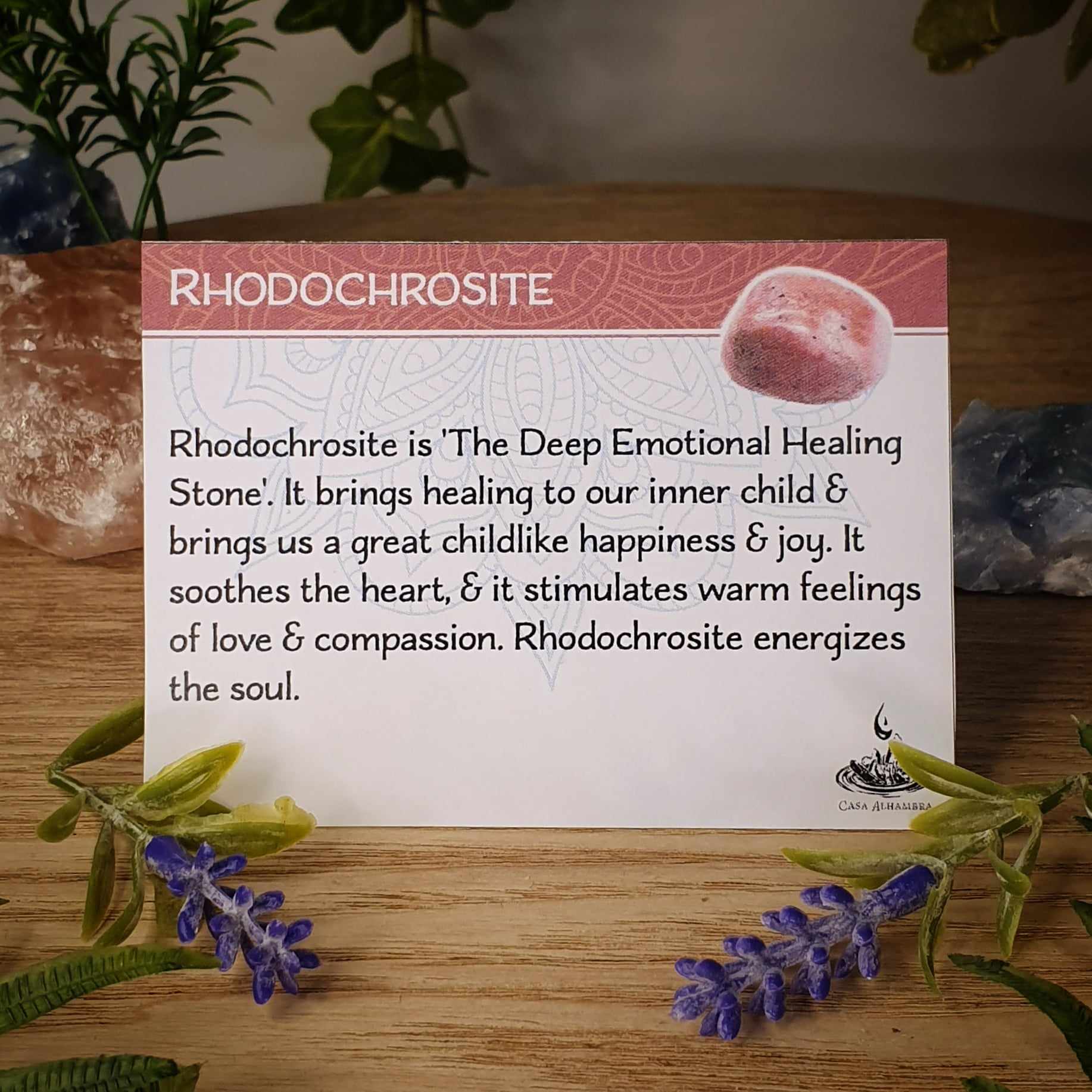 Rhodochrosite: Rhodochrosite is known as ‘The Deep Emotional Healing Stone’. It brings healing to our inner child & brings us a great childlike happiness & joy. It soothes the heart, it stimulates warm feelings of love & compassion. It energises the soul.