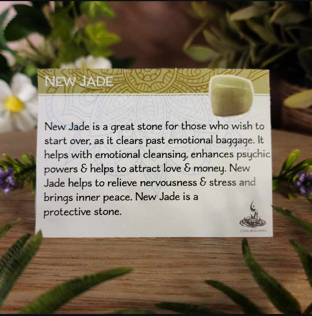 New Jade is a great stone for those who wish to start over, as it clears past emotional baggage. New Jade helps with emotional cleansing, enhances psychic powers and helps to attract love and money. It helps to relieve nervousness and stress and brings inner peace. New Jade is a protective stone.
