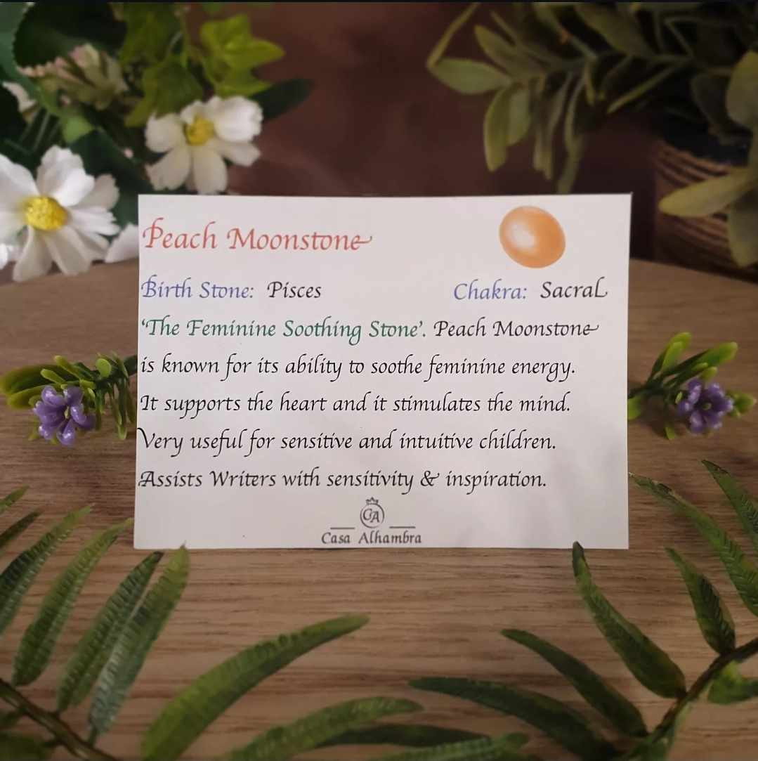 Peach Moonstone is known for its ability to soothe feminine energy. It supports the heart and it stimulates the mind. It is very useful for sensitive and intuitive children. It also assists writers with sensitivity and inspiration.