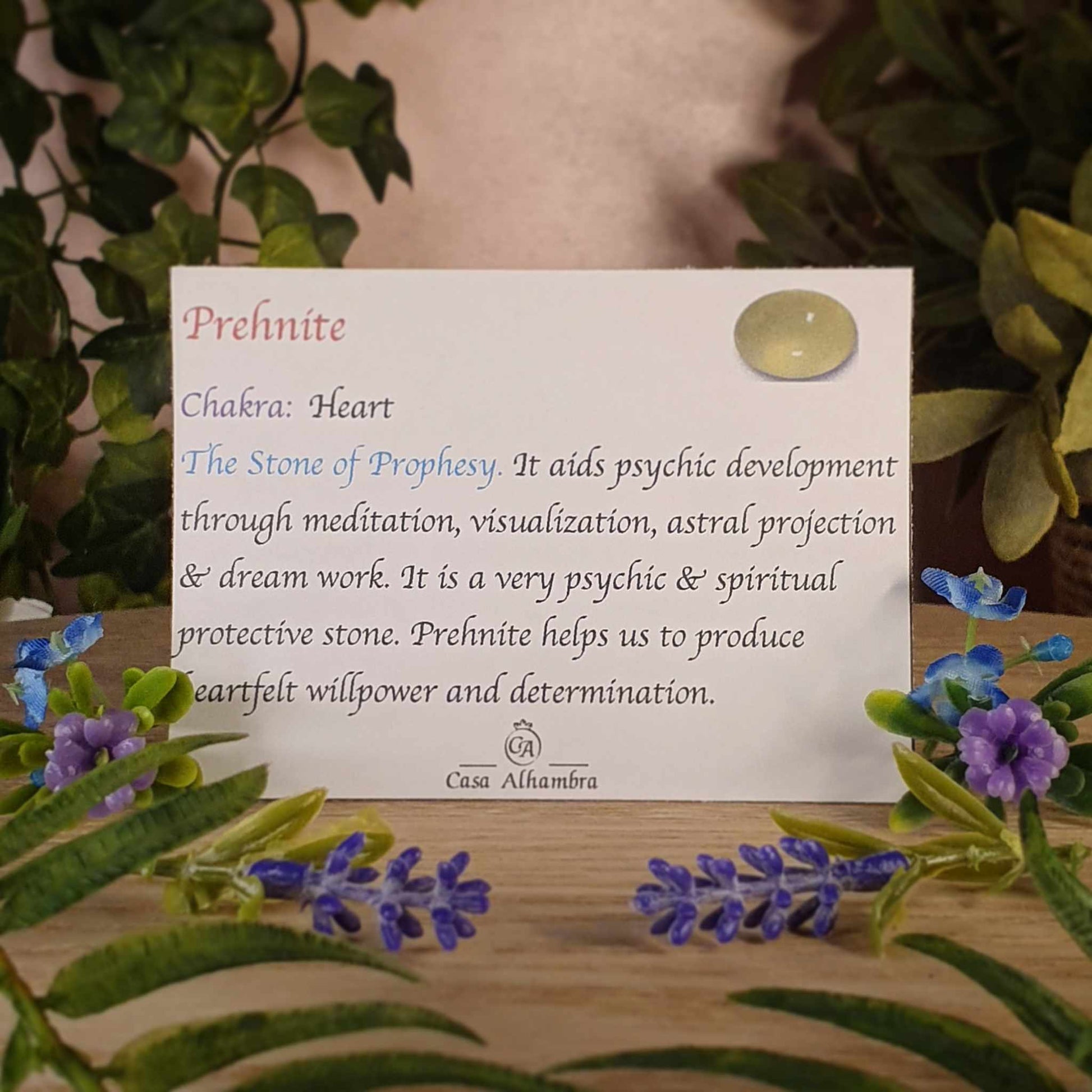 Prehnite is known as the Stone of Prophesy. It aids psychic development through meditation, visualization, astral projection and dream work. It is a very psychic and spiritually protective stone. Prehnite helps us to produce heartfelt will power and determination.