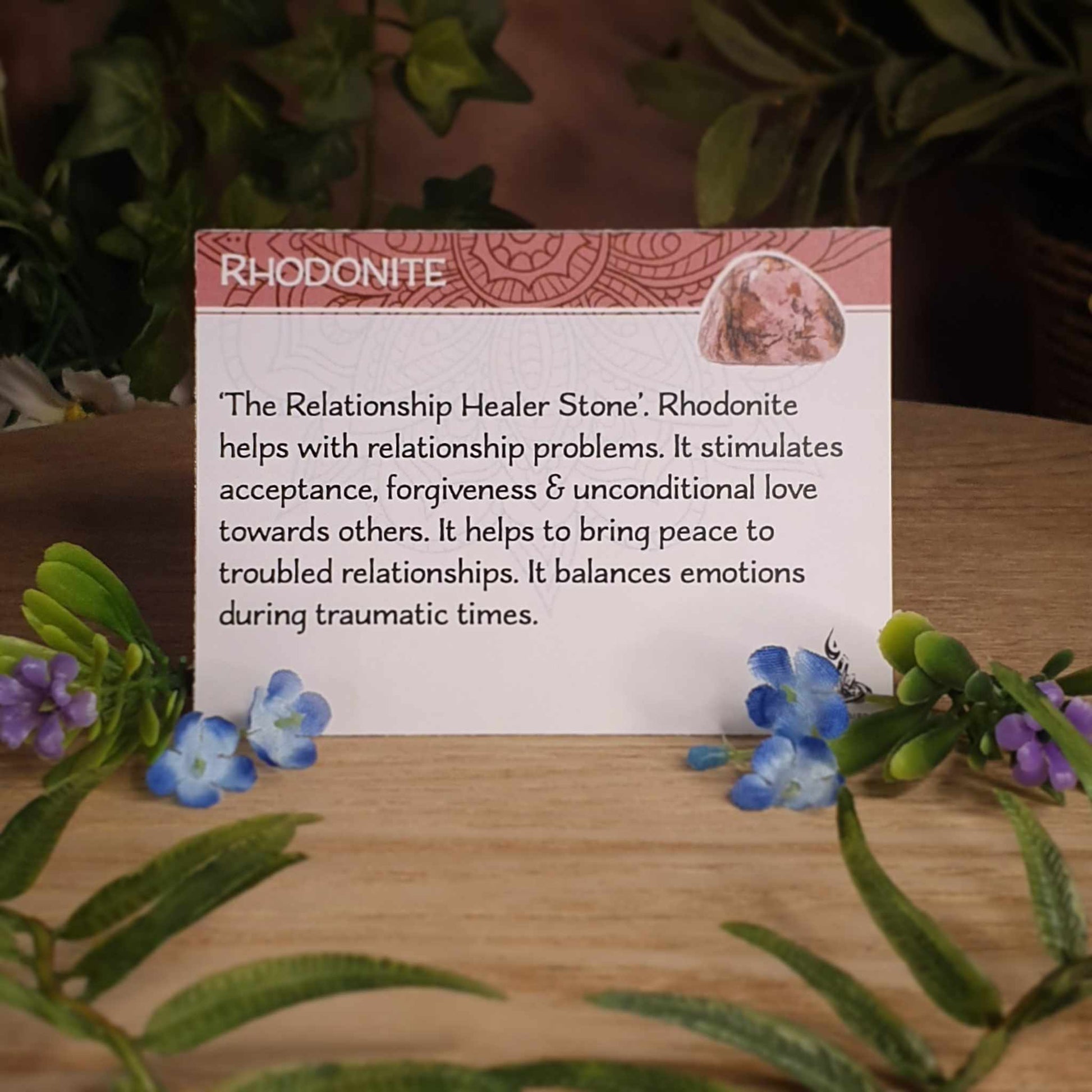 Rhodonite is known as the Relationship Healer. It helps with relationship problems. It stimulates acceptance, forgiveness and unconditional love towards others. It helps to bring peace to troubled relationships. It balances emotions during traumatic times.