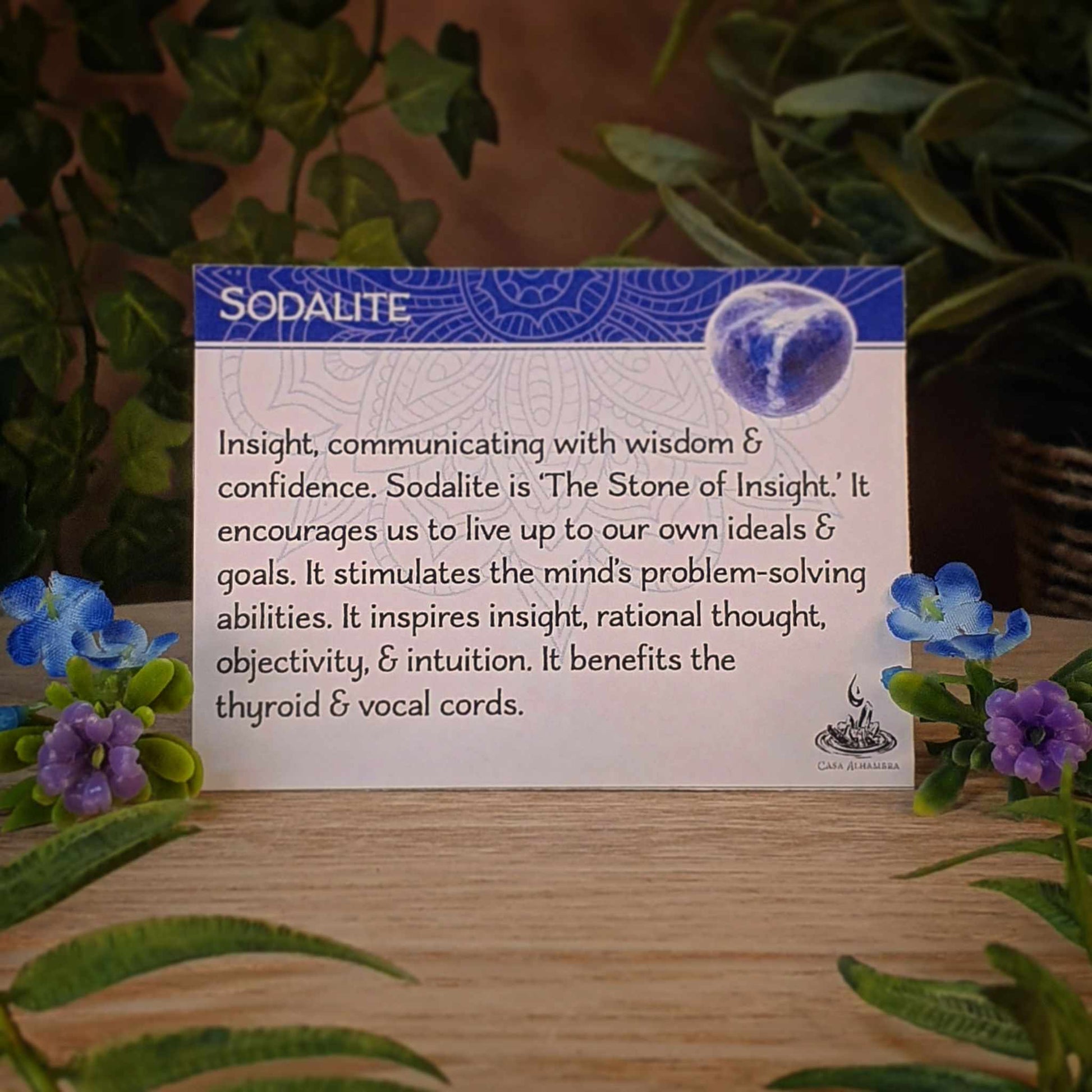 Sodalite is the stone of insight and communication. It helps us to express ourselves with wisdom and confidence. Sodalite encourages us to live up to our own ideals and goals. It stimulates the mind's problem-solving abilities. It inspires ration thought, objectivity, and intuition. It benefits thyroid and vocal cords.