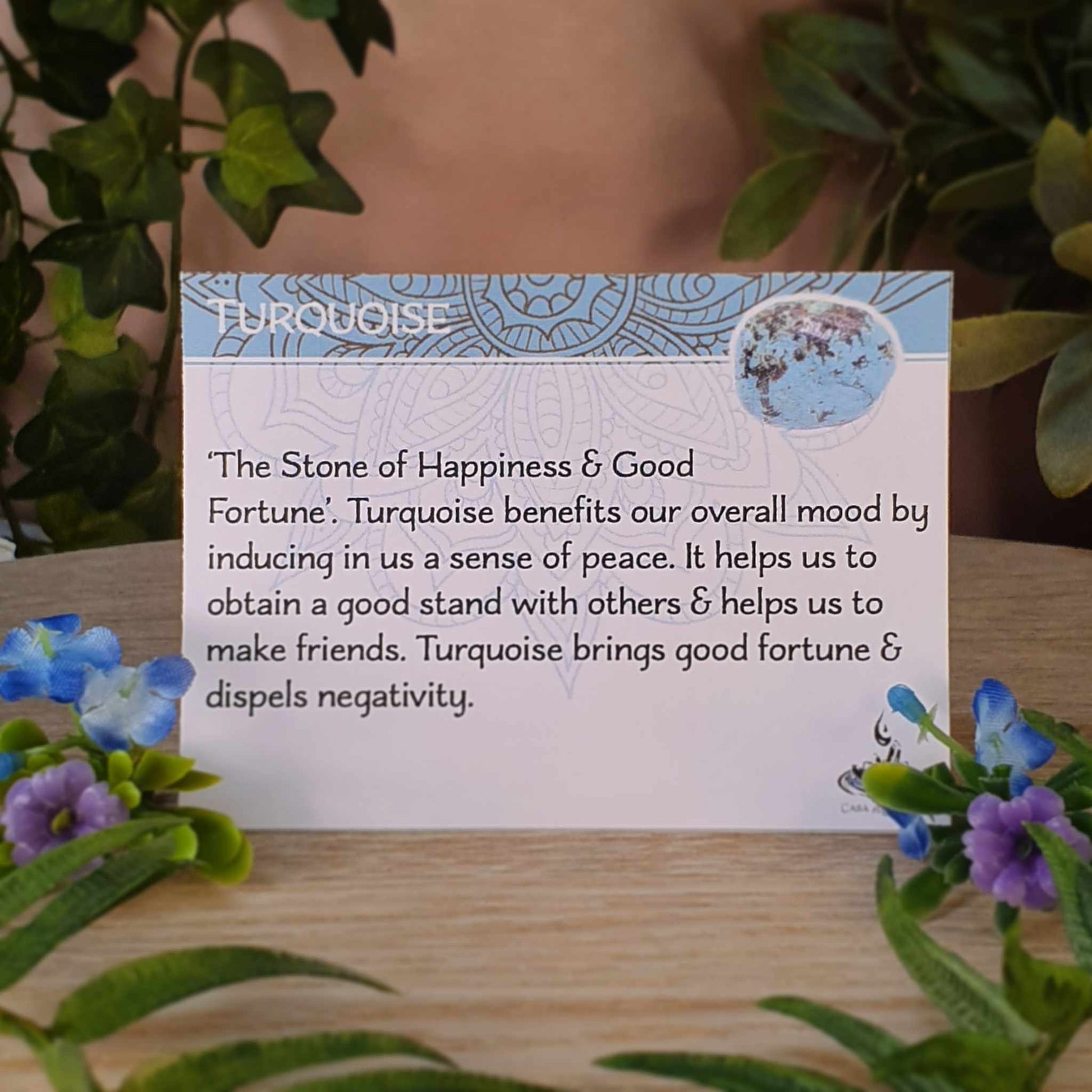 Turquoise is known as the "Stone of Happiness and Good Fortune" It benefits our overall mood by inducing in us a sense of peace. It helps us to obtain a good stand with others and helps us to make friends. Turquoise brings good fortune and dispels negativity.